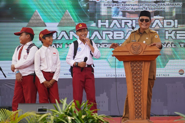 Momen Hari Jadi Kota Banjarbaru ke-24 dijadikan Gubernur Kalsel H. Sahbirin Noor atau Paman Birin sebagai ajang berbagi kebahagiaan, terutama dengan anak-anak SD yang datang untuk memeriahkan peringatan hari jadi kota Banjarbaru tersebut.